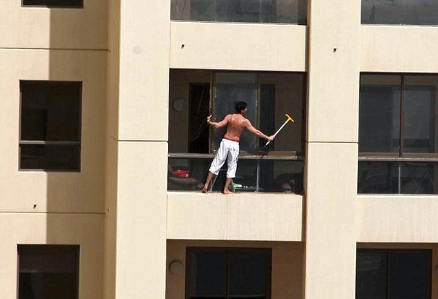 He was snapped making sure the windows were sparkling by a resident in a neighbouring apartment block.